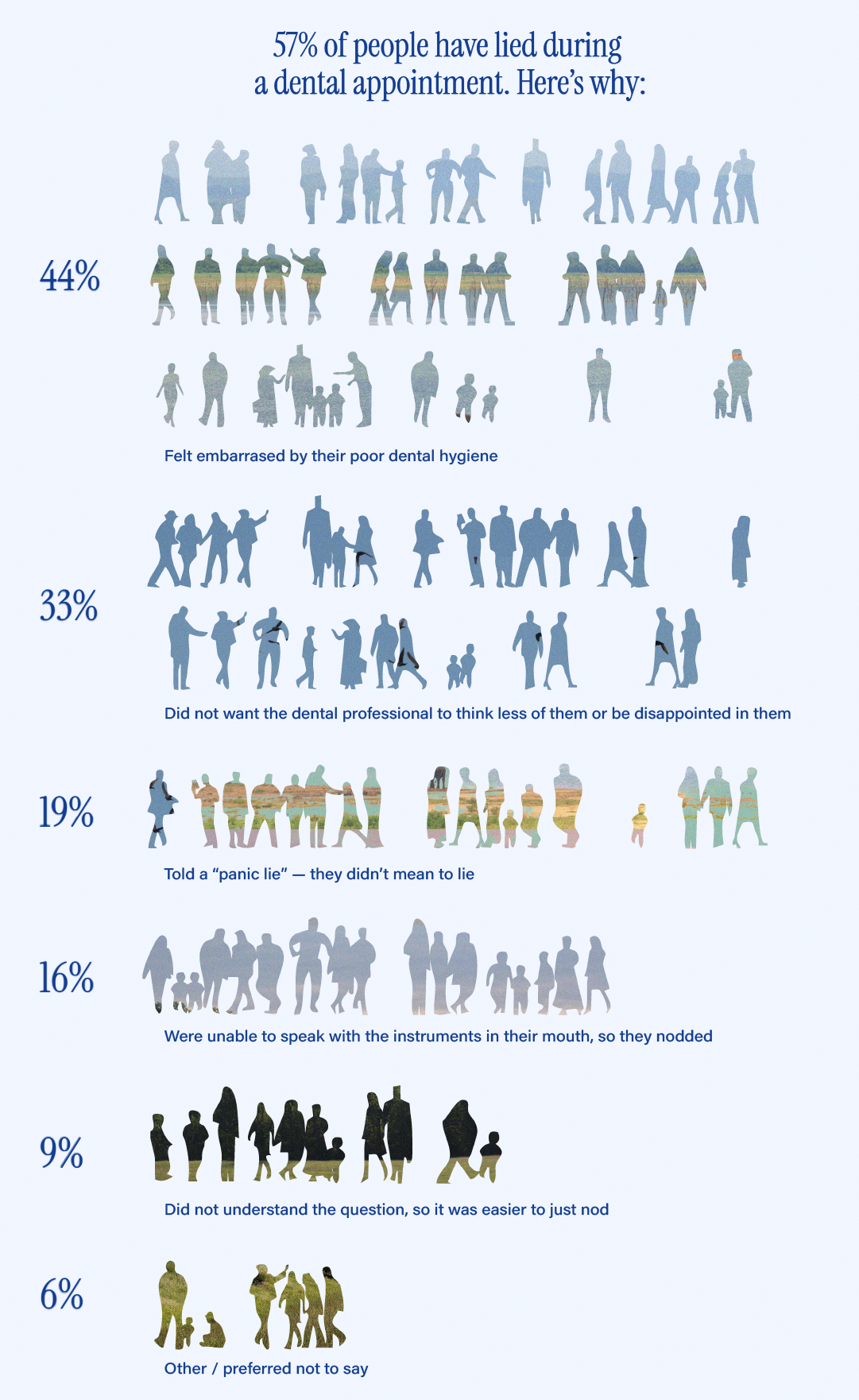 In a survey of 2000 Americans, over half of the respondents (57%) admitted to lying to their dentist about their oral care routine. 44% of them did it because they felt embarrassed by their poor dental hygiene and a further 33% wanted to avoid their dentist thinking less of them. All this highlights just how tightly oral care is associated with perceptions of “responsible behaviour”.